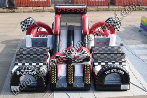 Our Speedway 500 Obstacle Course is a massive 102 feet of Inflatable all branded up with racecars and checker flags. This Obstacle course features a 15-foot dual lane slide in the middle perfect for kids, teens, and adults