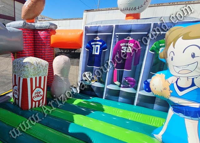 Our Sports-Themed Bounce House features a full Baseball Stadium look and feel. It also has a big inflatable Cheerleader, locker room, popcorn, and peanuts. and a bug hockey player on the side