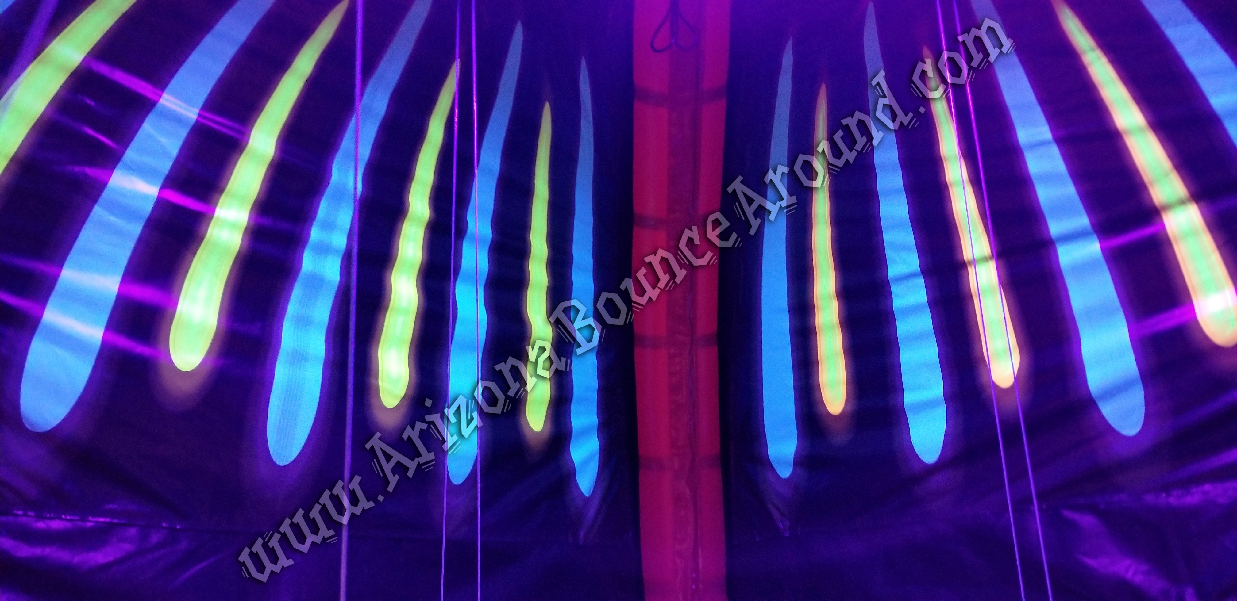 Our Blacklight Tilt-A-Maze is a huge inflatable sealed air tent with a 4 player maze game suspended from cables that take a team effort to play based on balance. Each player has a mini handlebar to pull on the cable to roll the ball across the maze board.